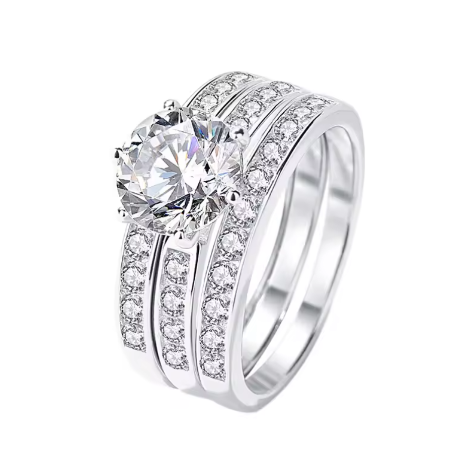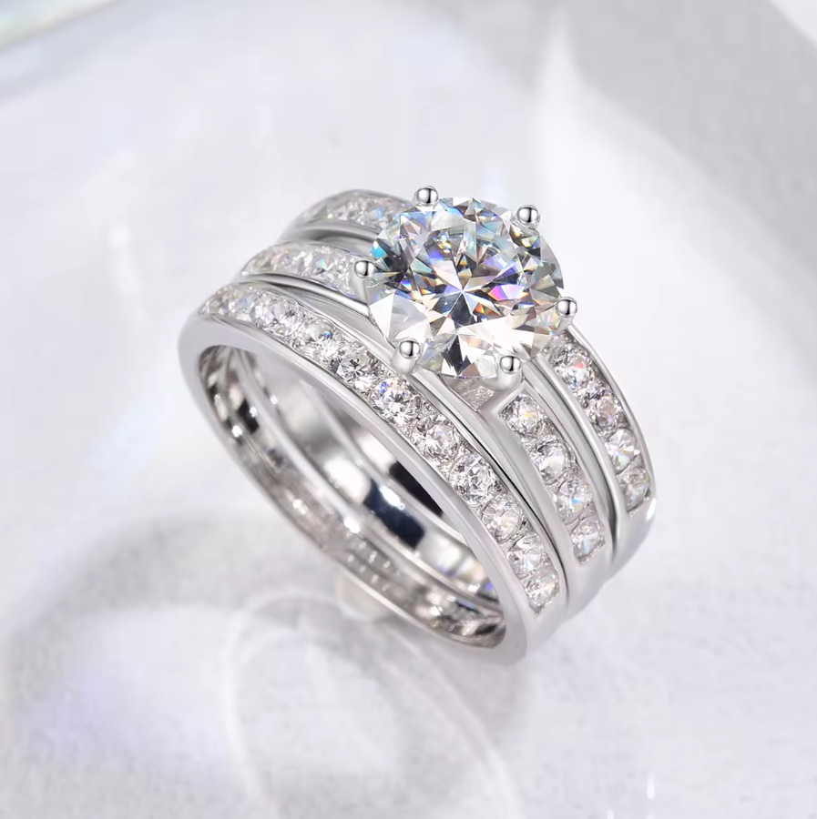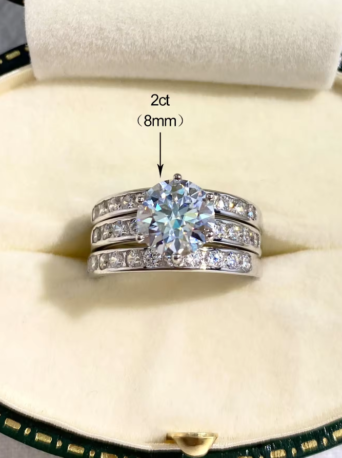Notre bague de fiançailles à trois rangées de diamants est composée d'une paire de demi-alliances jointes en bas. Le design intemporel de cette parure de bagues de VVS Jewelry offre un éclat unique et une élégance classique qui durera toute une vie.