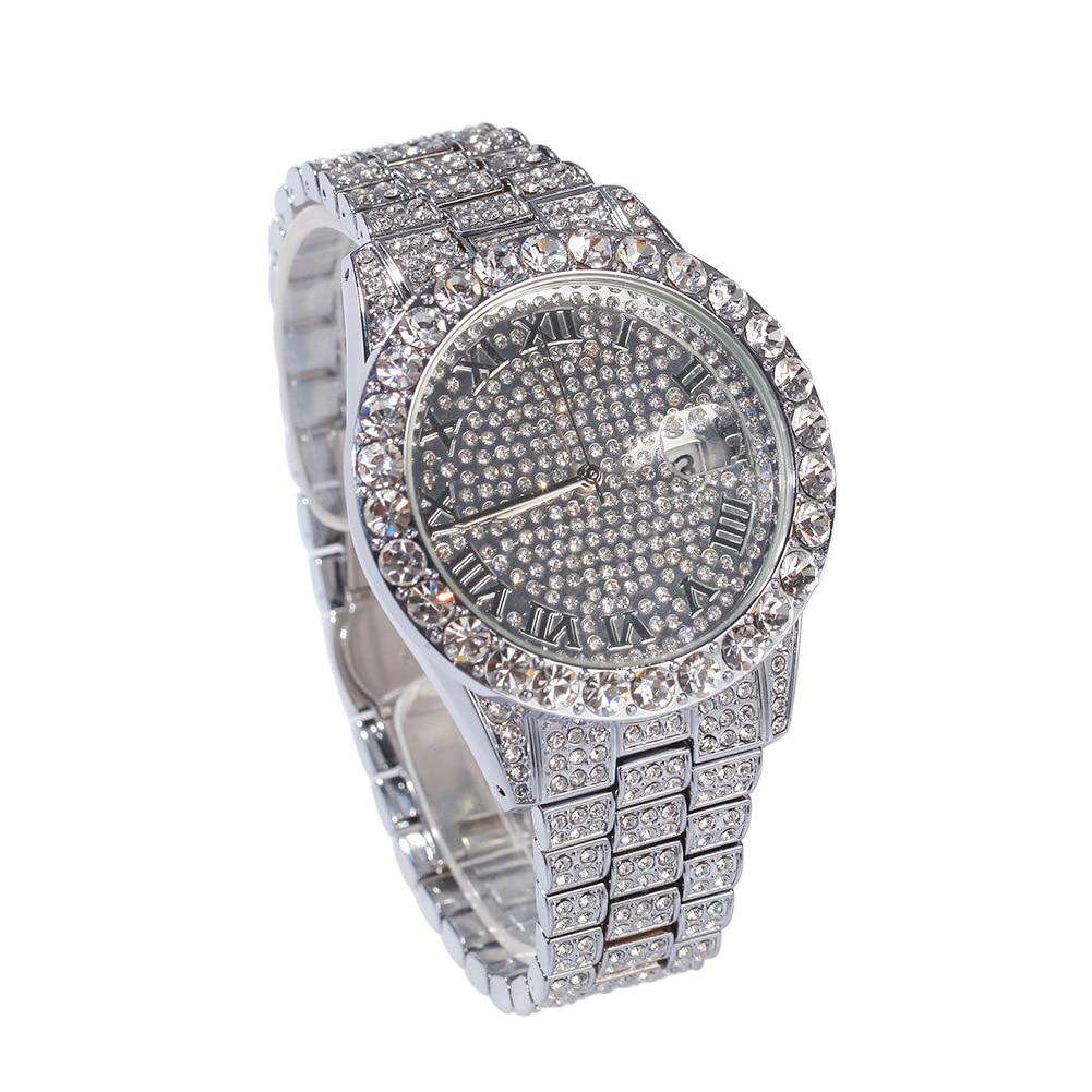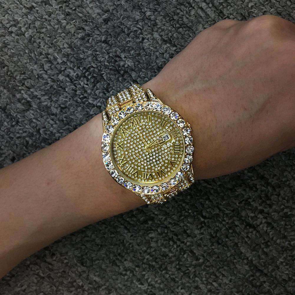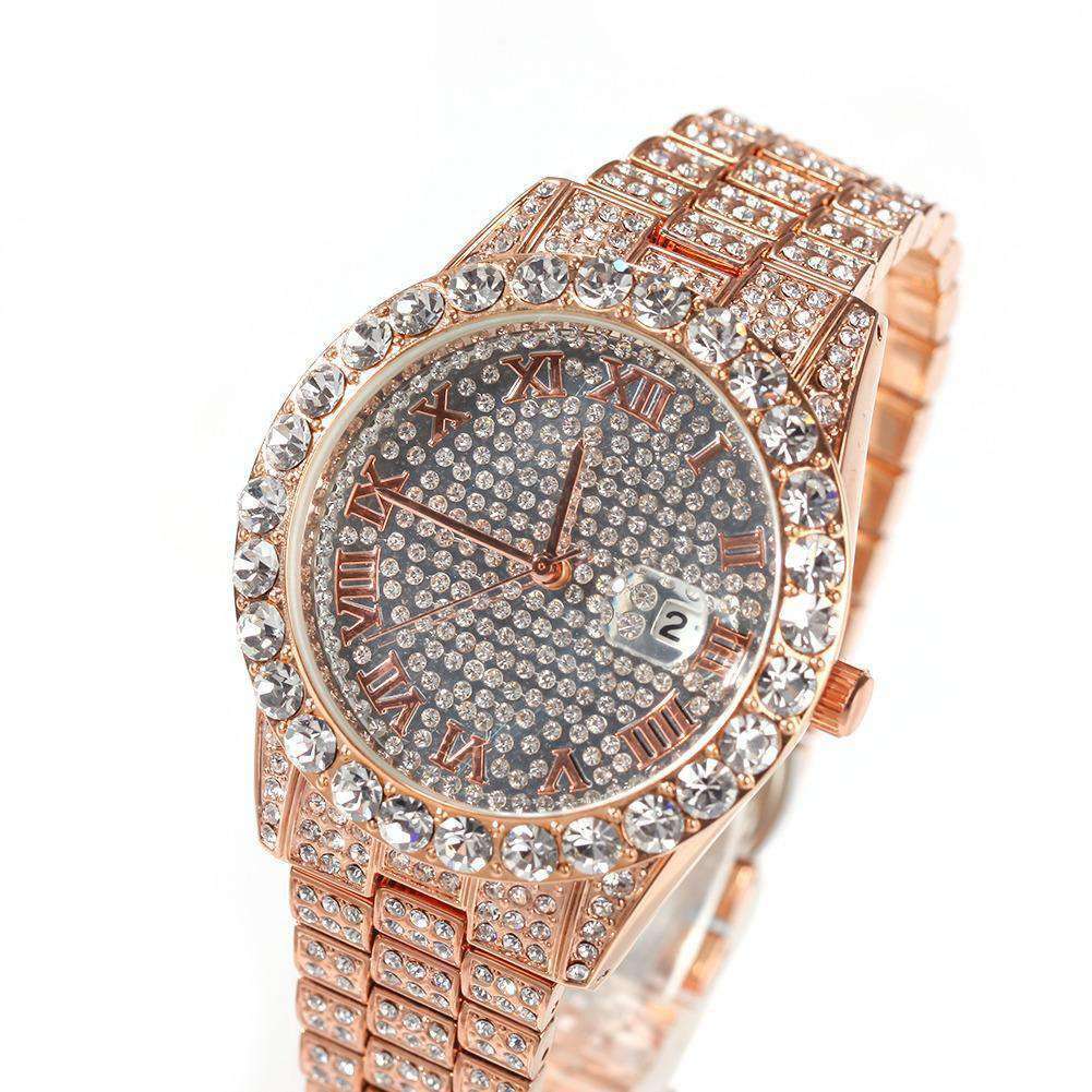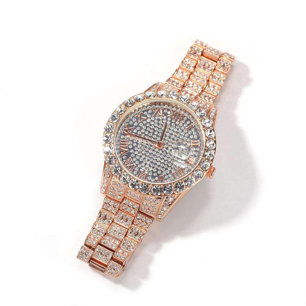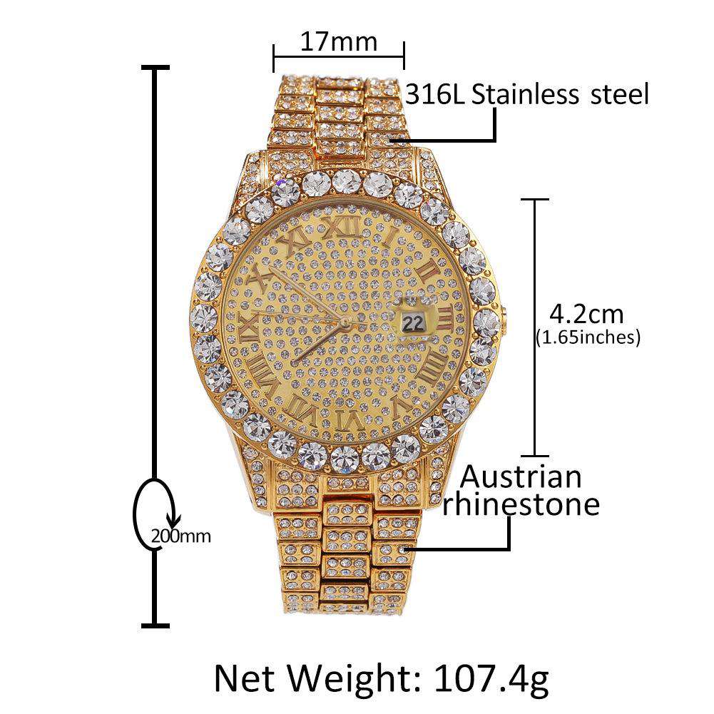 Die Diamondz Bust Down Watch ist aus hochwertigem unedlem Metall gefertigt und mit einem atemberaubenden Goldton und glitzernden Gliedern versehen, die wie zerkleinerte Steine aussehen.