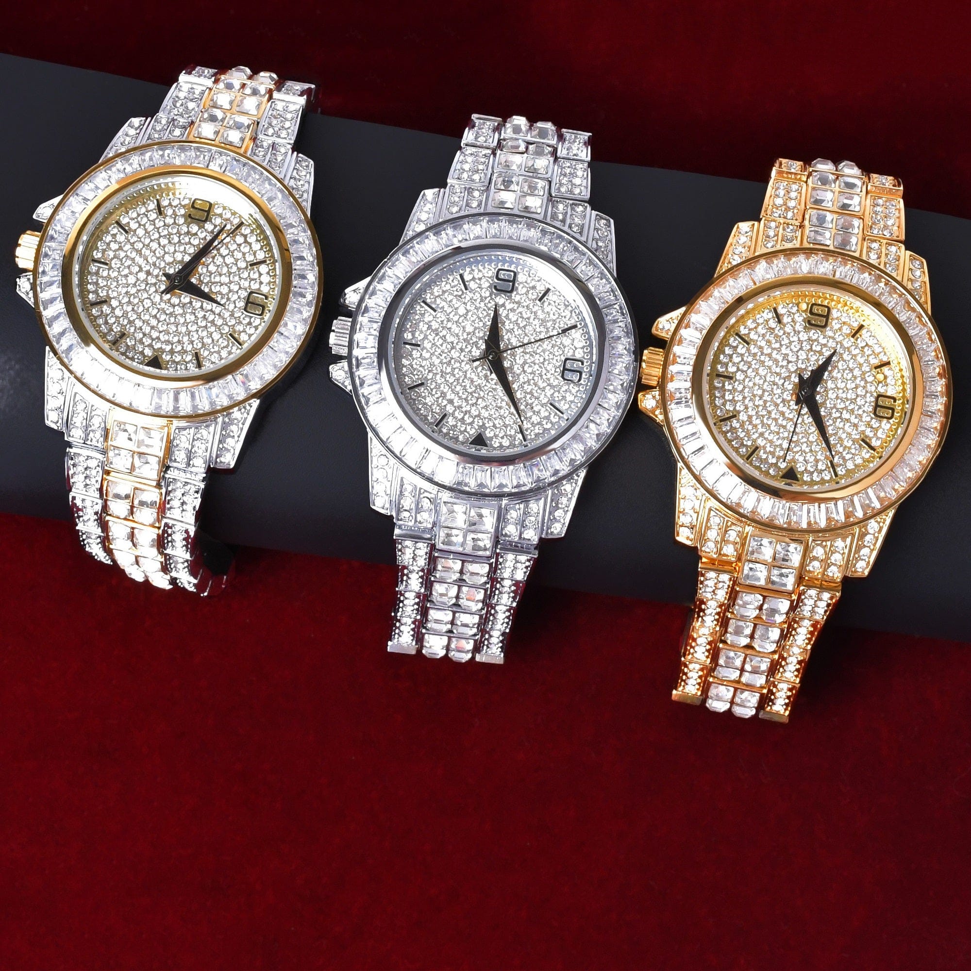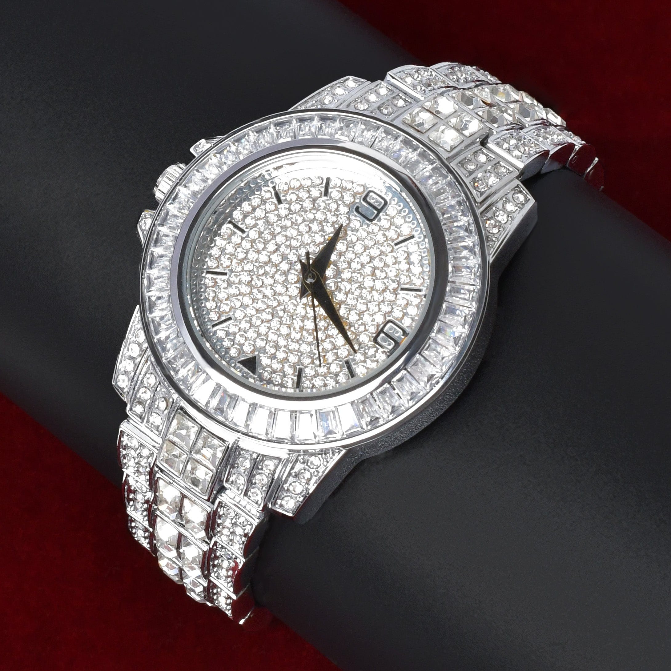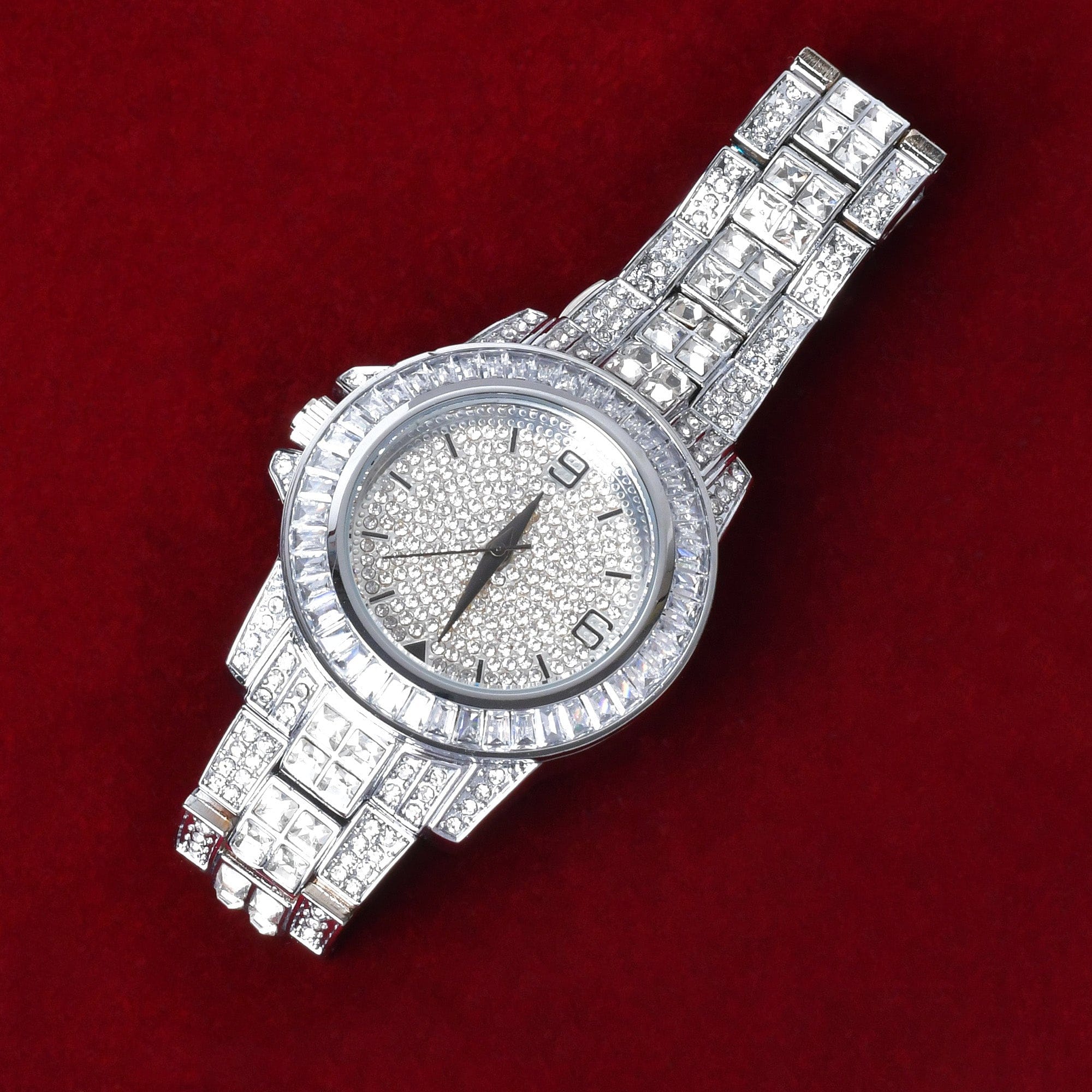 Sieht aus wie eine 30.000-Dollar-Uhr. Es ist vollständig mit über 17 Karat echten tschechischen Kristallen bedeckt. Das gesamte Zifferblatt, die Lünette, das Gehäuse und das Band sind vereist. Das Zifferblatt ist ebenfalls mit ausgefallenen Steinen im Baguetteschliff verziert. Die Uhr besteht aus legiertem Metall und verfügt über ein Mineralglas. Im Inneren wird es von einem japanischen Quarzwerk angetrieben, das für eine zuverlässige Zeitmessung sorgt.