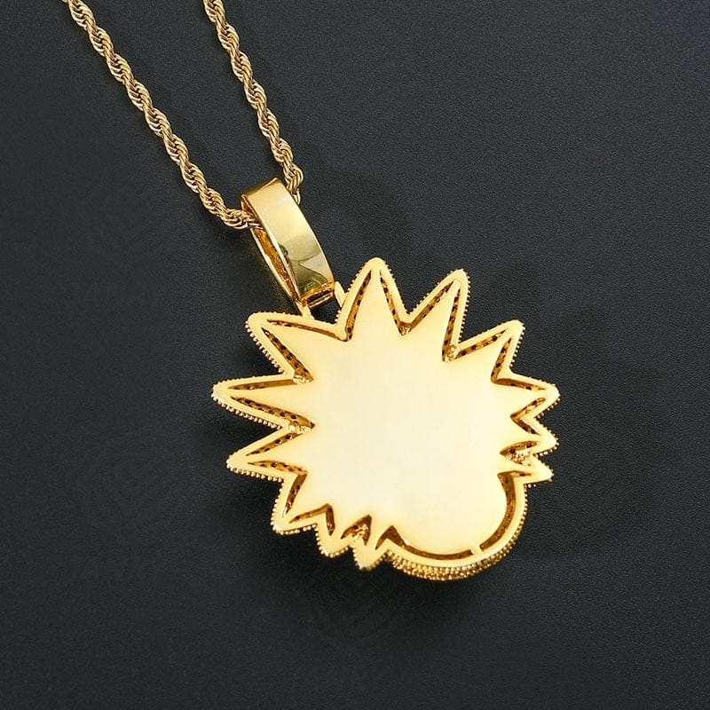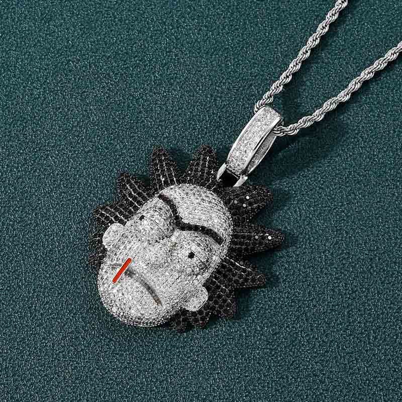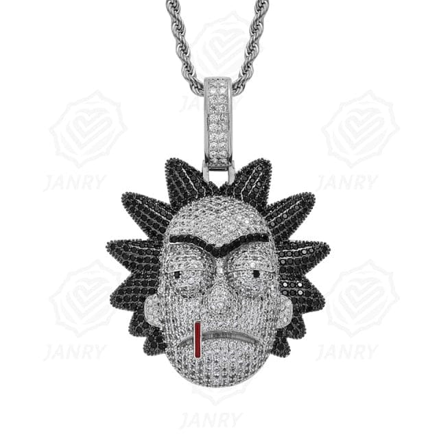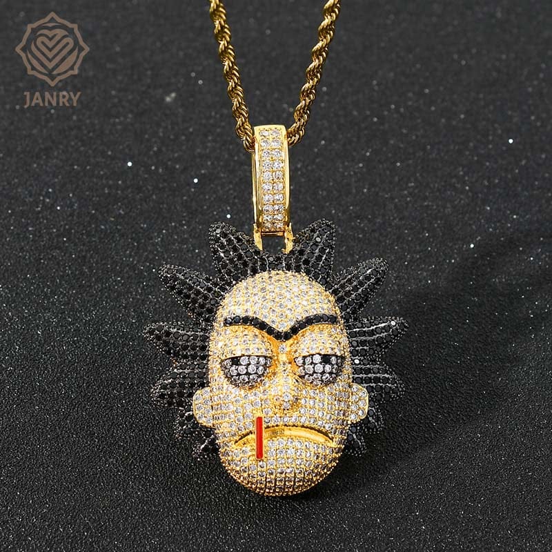 Der Evil Rick-Anhänger präsentiert den verrückten Wissenschaftler in VVS Diamond Simulate-Steinen und 14-karätiger Goldbeschichtung für eine lebendige Darstellung