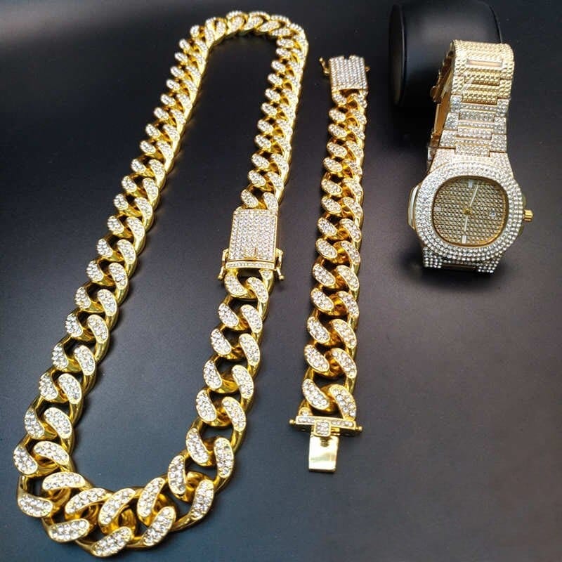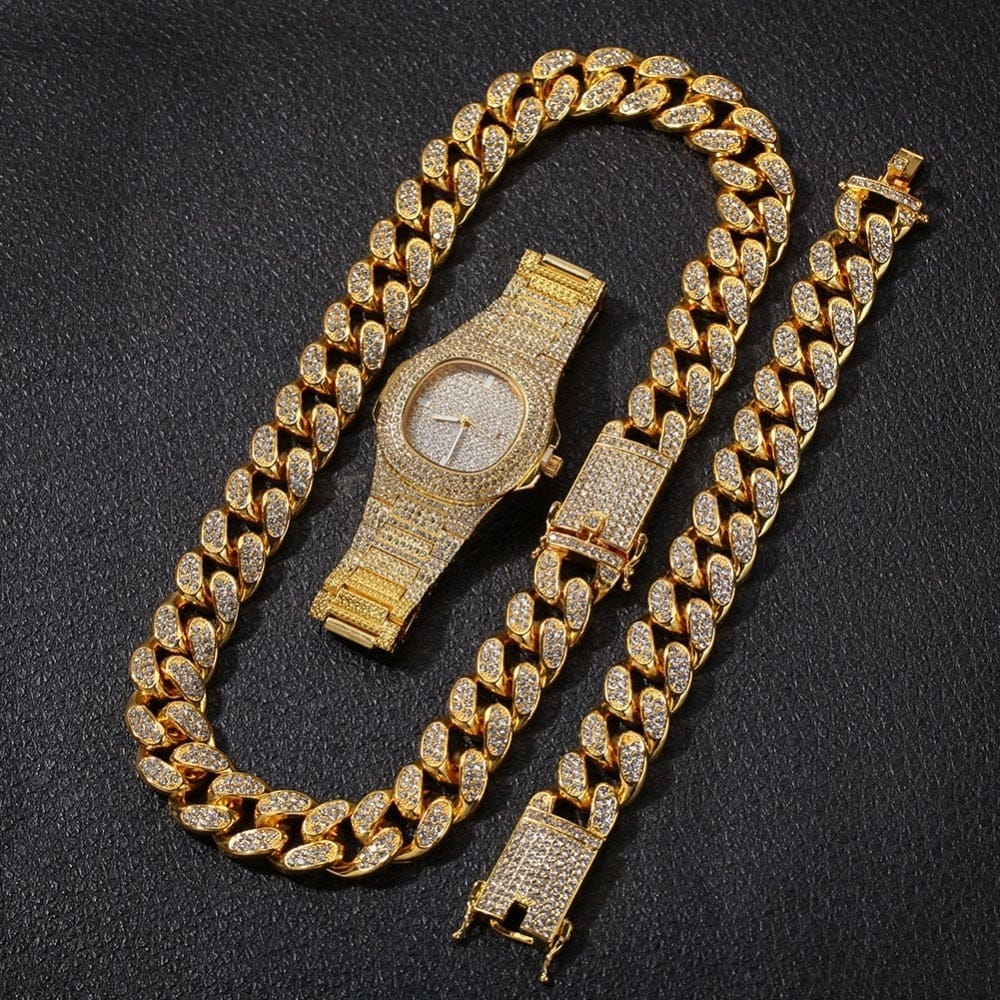VVS Jewelry Cuban Chain & Cuban Bracelet Bundle + Δωρεάν ρολόι OG Bust Down