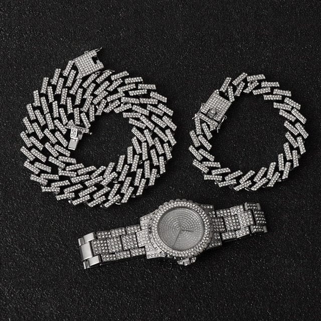 Conjunto Miami Micro Pave Cuban Cadena + Pulsera + Reloj