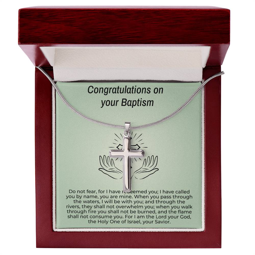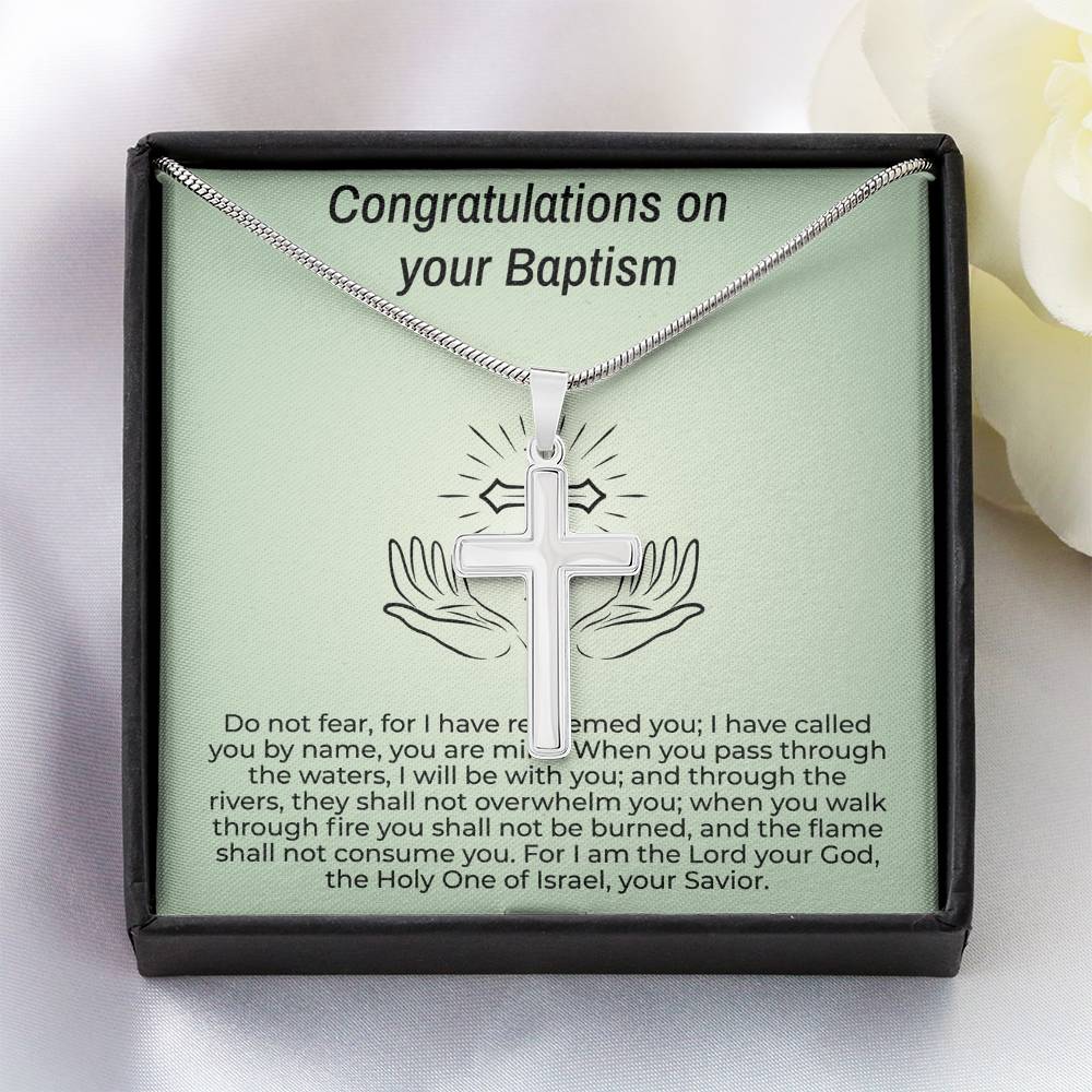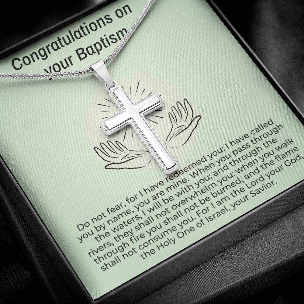 Ajoutez une touche chaleureuse à votre cadeau de baptême avec notre collier croix avec carte de message de baptême. Le délicat collier croix est livré avec une carte de message personnalisée, ce qui en fait le moyen idéal d'exprimer votre amour et votre soutien. Le cadeau idéal pour célébrer cette occasion spéciale. Bénédictions incluses !