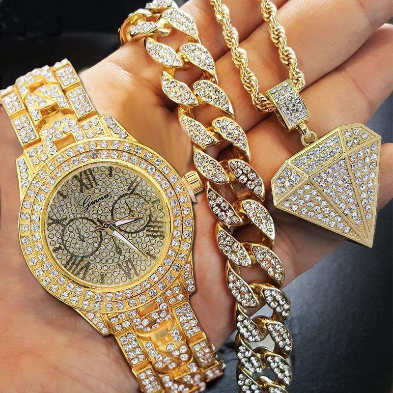 Drip Icy Cuban Chain Bracelet + Diamond Necklace + Watch Set