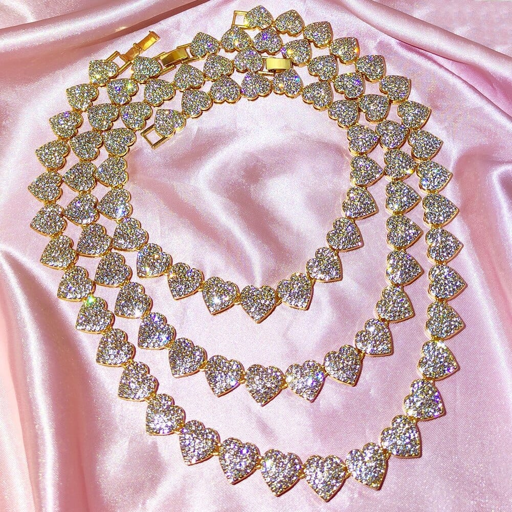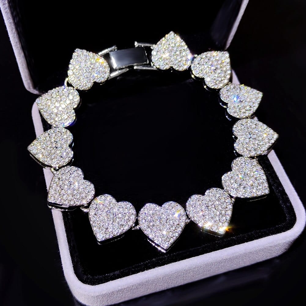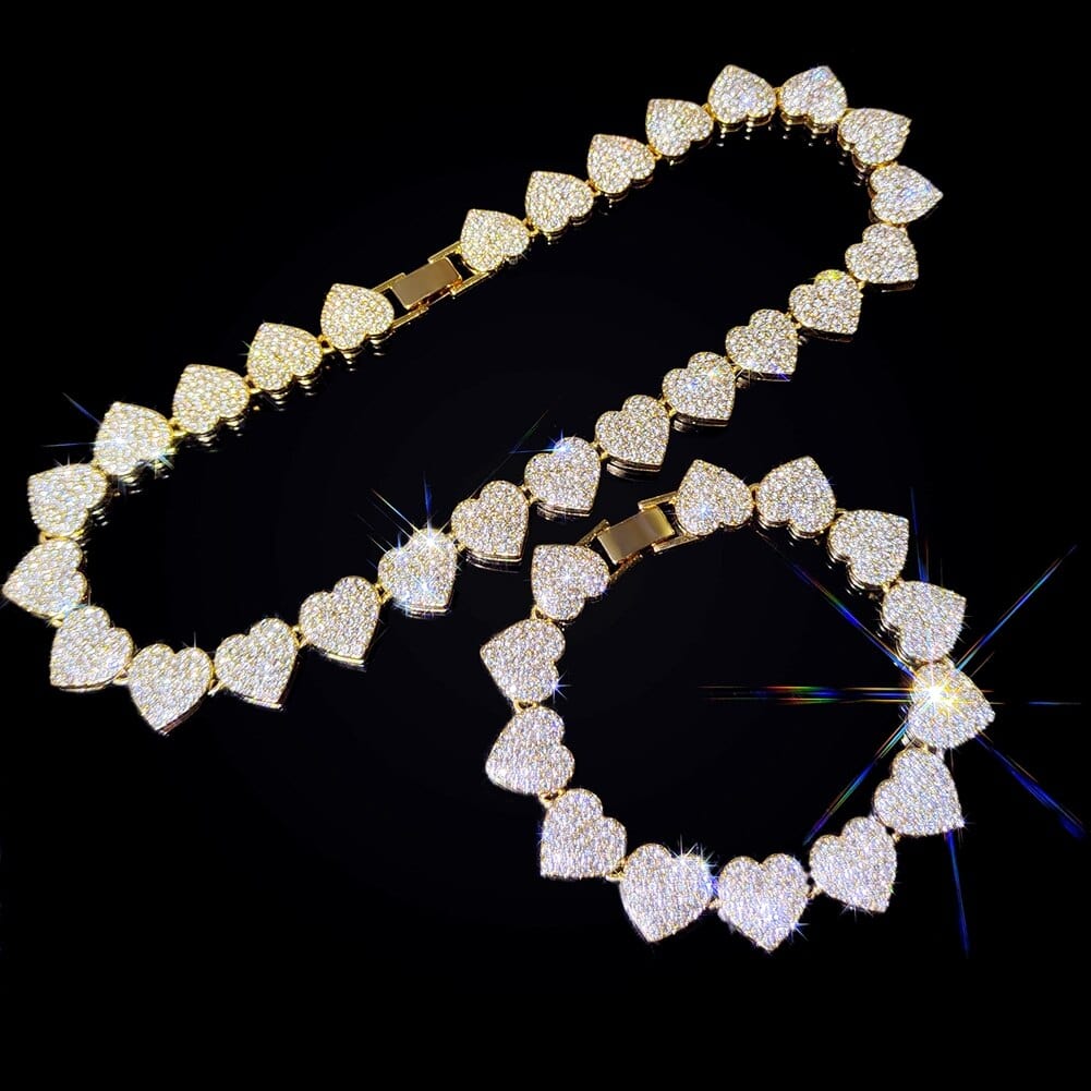 This iced out tennis chain and bracelet have a heart shape that is unique from the commonly bought pieces of jewelry. Its icey appearance makes it shine, bringing your overall look to another level. It is made of premium metals to make it last a long time and be safe to use.