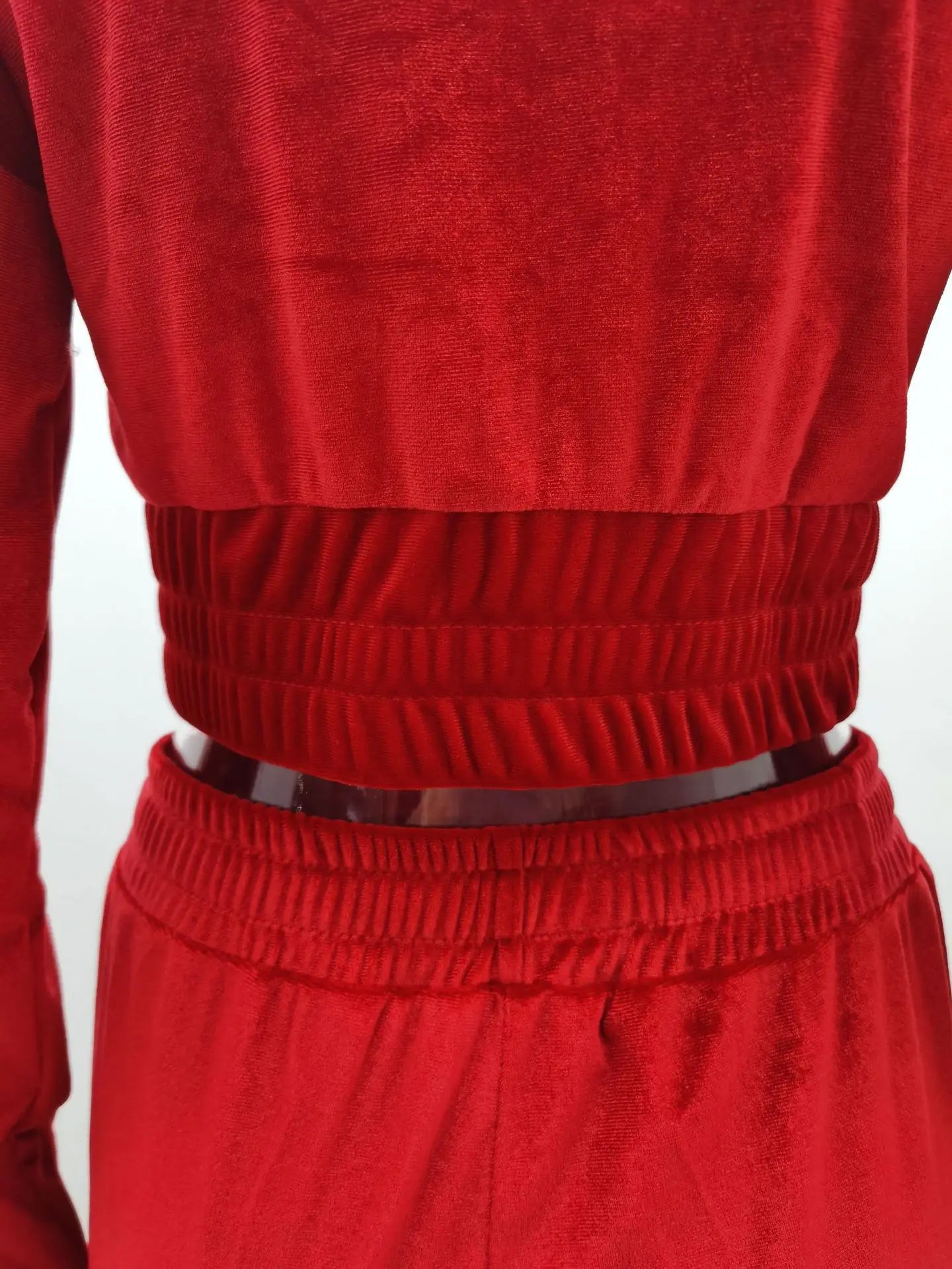 This Velvet Hoodie Crop Top Tracksuit is crafted with superior quality velvet fabric to deliver unparalleled comfort. The relaxed fit of the tracksuit ensures unrestricted movement, making it perfect for sports and casual activities. It features a hoodie top and a contrast drawstring waistband for an adjustable fit. The crop top is perfect for lounging or exercising in style.