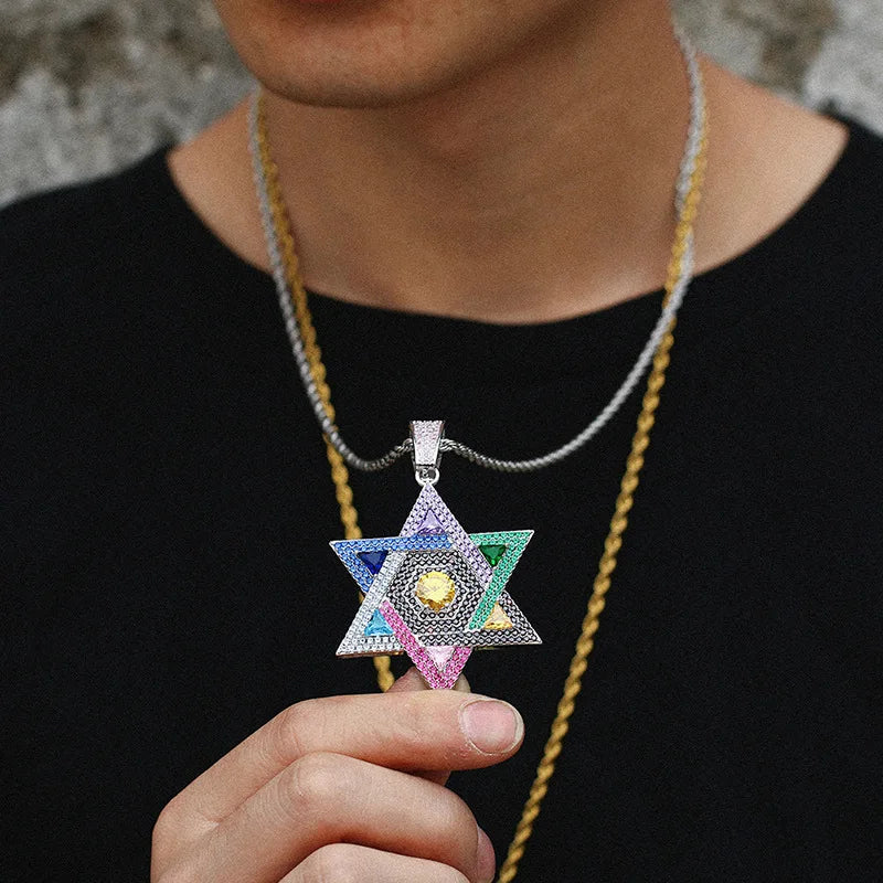 Unleash your bold and adventurous side with our Bling Ice Out Multicolour Star of David Necklace. Featuring a stunning, multicoloured Star of David pendant, this necklace is sure to make a statement. Stand out from the crowd and add some sparkle to your outfit with this eye-catching piece!