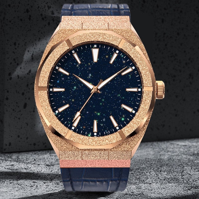 This carefully crafted frosted case encloses the captivating aventurine dial in a silvery shroud. Add luminous hands and indices to the mix, and you have the timepiece equivalent of the Northern Star.